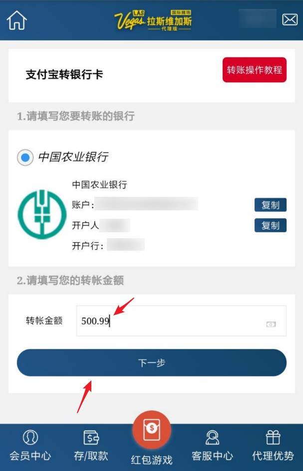 请您记录好公司收款银行账户,填写您的转账金额,点击下一步。
